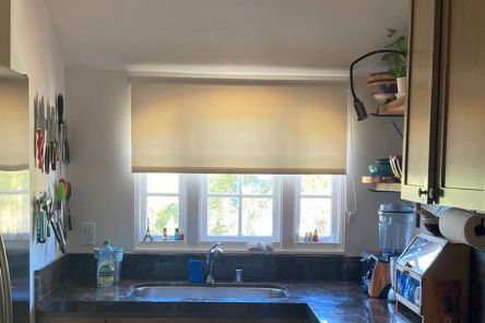 Barbara requested custom pull down window shades for her kitchen window to enhance privacy and control natural light.